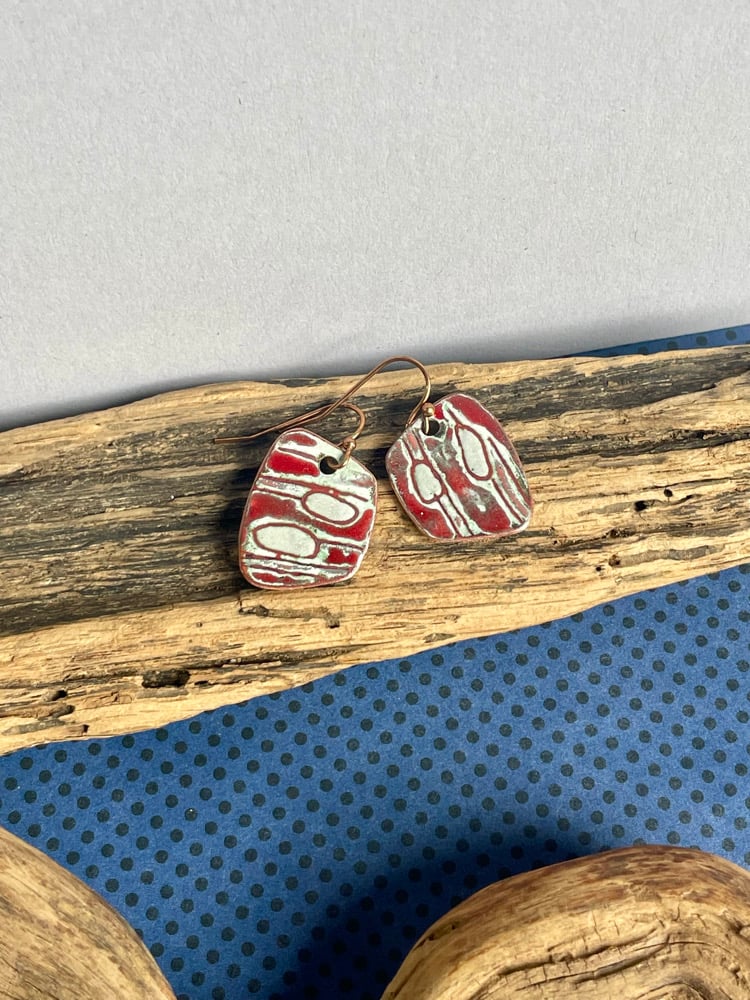 Then front painted with white enamel. Dried. Then sgraffito design, torch fired. Then painted colors with wet enamel. Let dry. Clean design, then torch fired again. Sanded edges.