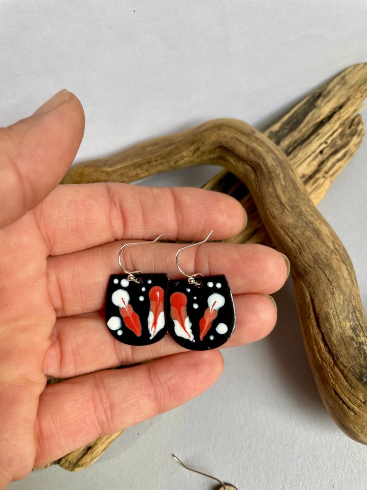 Torch fired powdered glass to copper. Counter enamel is black (backside)