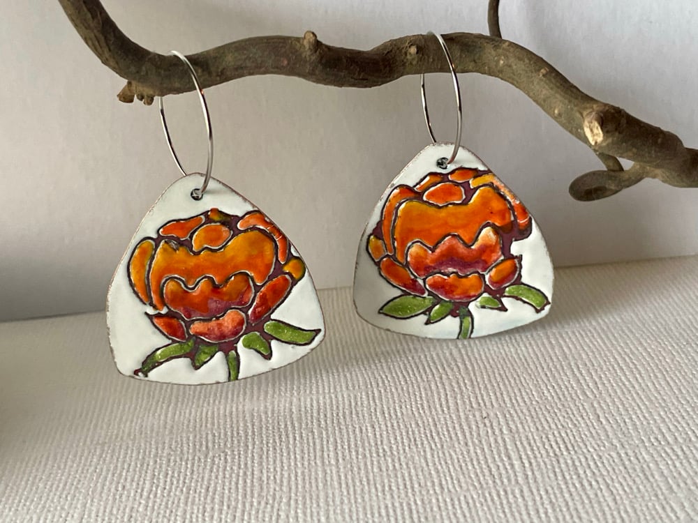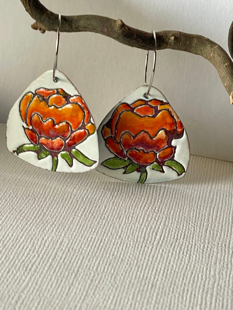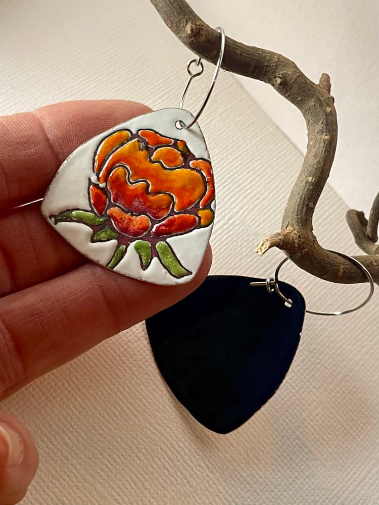 •Using liquid form enamel, painting the front, letting dry, then sgraffito a design (hand drawn)
