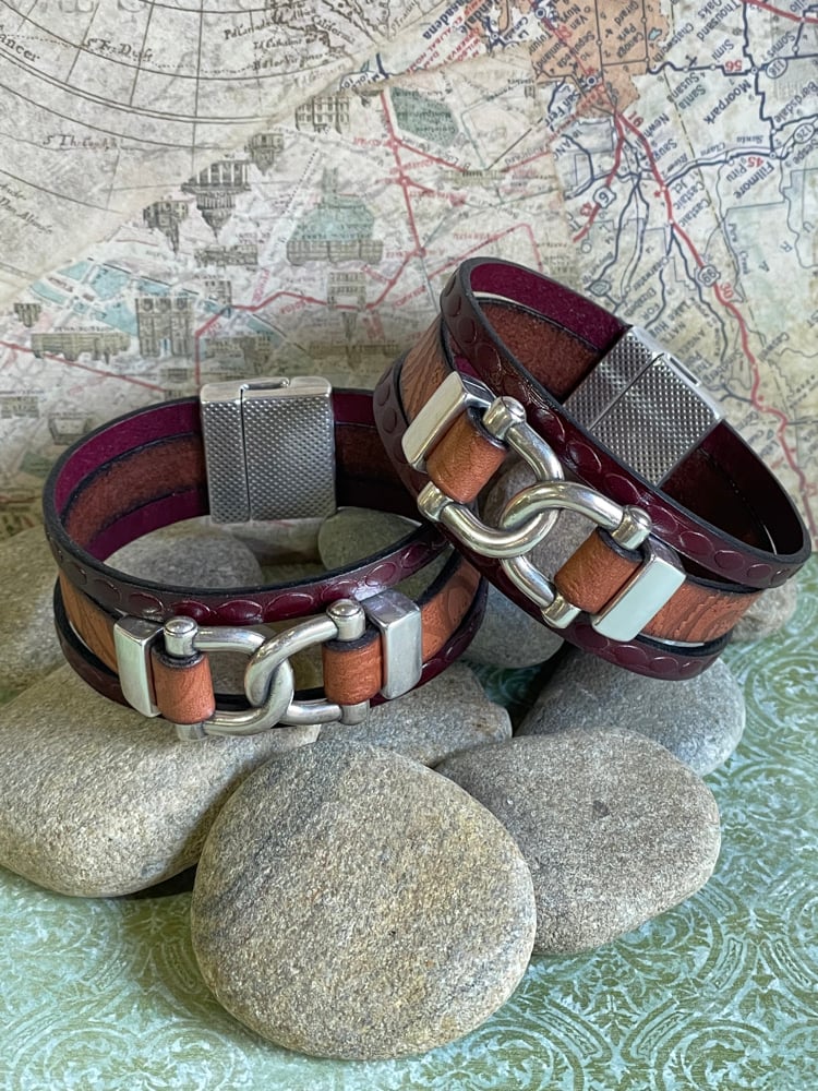 A 20mm wide situation of beautiful European leather of deep burgundy and an embossed wide cinnamon brown.