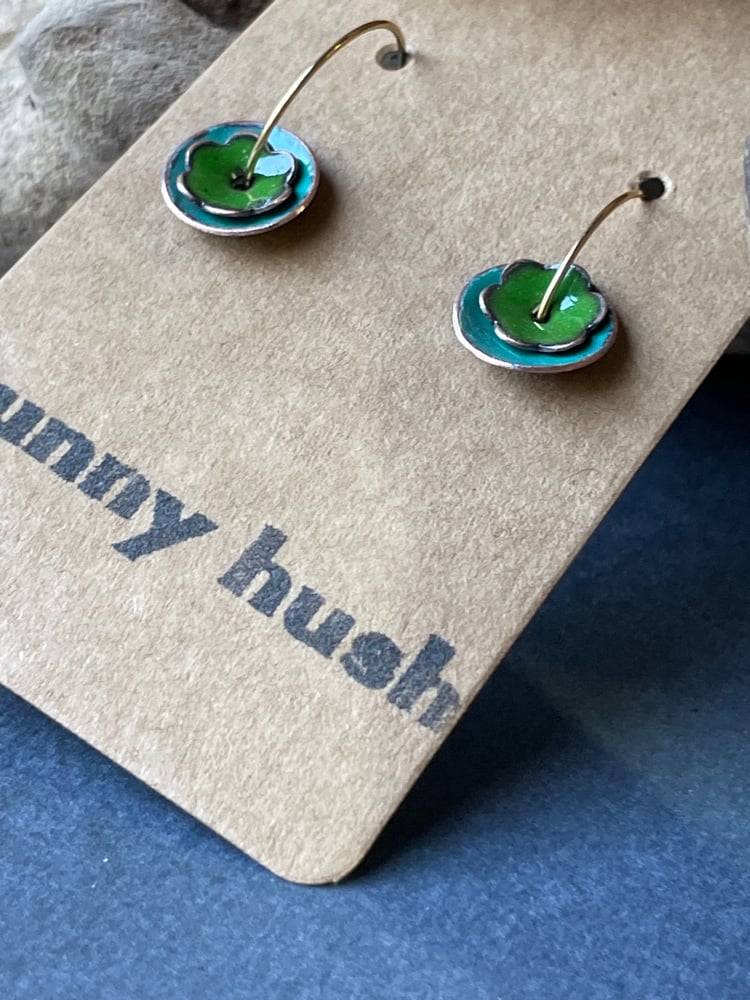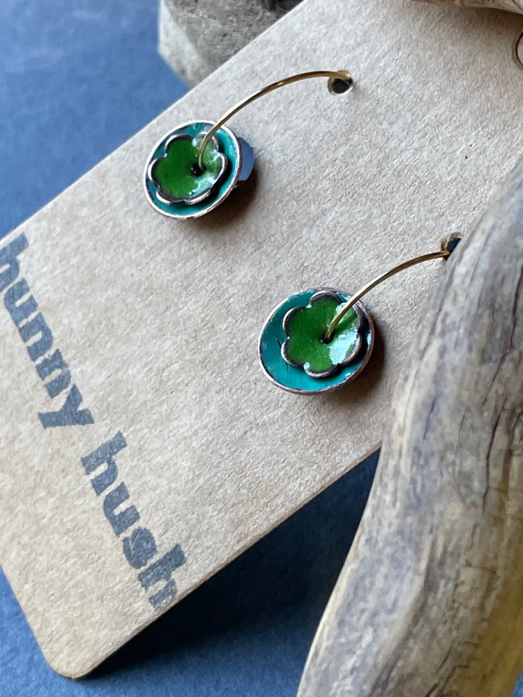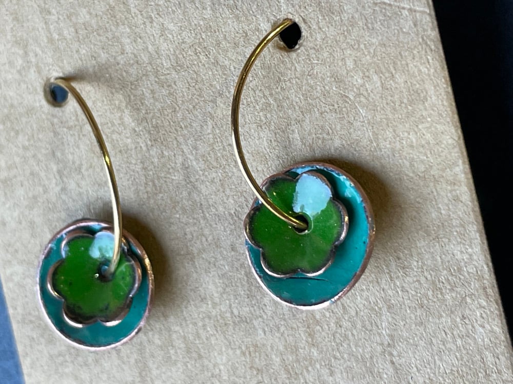 Small round spruce green with a flowered jungle green atop. Sanded edges to show the beauty of the copper shining through.