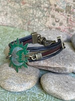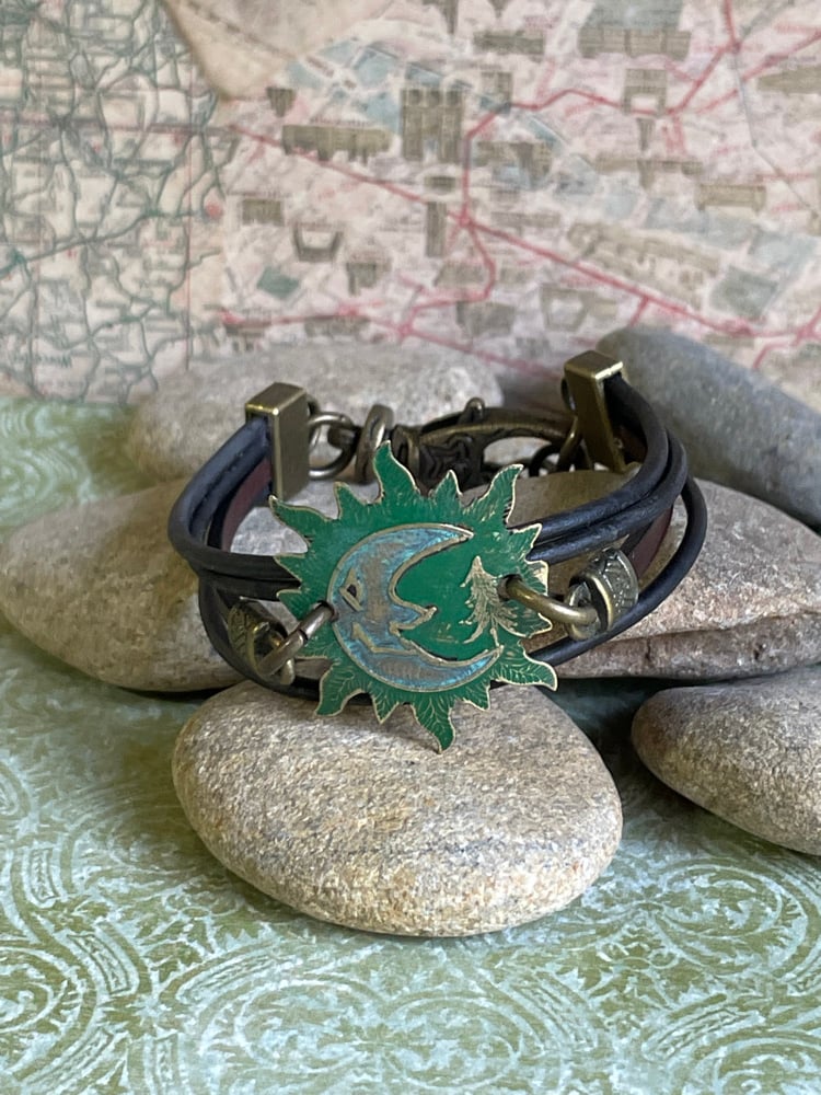 Etched in design. A 32 step process. Hand drawn, etched in an acid bath. Cleaned. Scrubbed. Sanded. Many layers of paint. Sealed 3 x’s. Holes punched. Then attached with metal components and leathers.