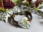 Then front painted with white enamel. Dried. Then sgraffito design, torch fired. Then painted colors with wet enamel. Let dry. Clean design, then torch fired again. Sanded edges.
