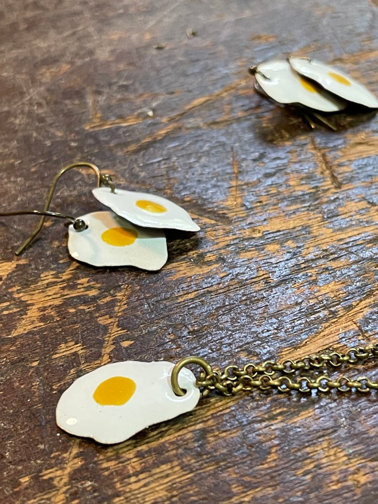 Hand cut copper, punched hole, counter enamel (backside) enameled white with yellow yoke.