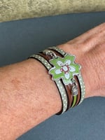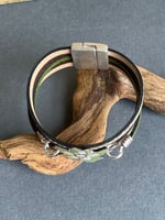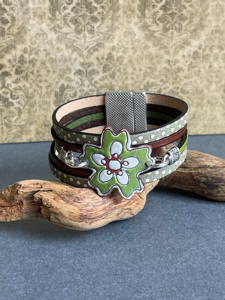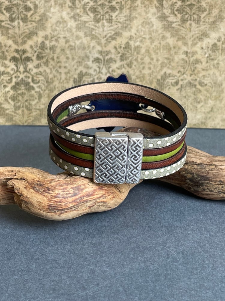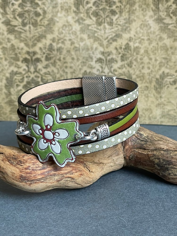 Leather are 2 strands Green and white polkadot, 2 strands dark chocolate brown and sage green. Magnetic clasp closure. Not Adjustable.