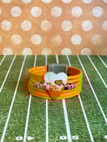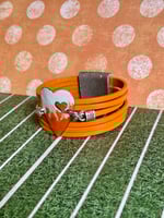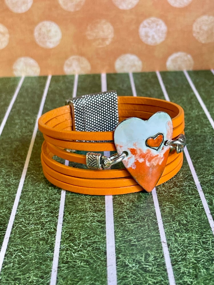Counter enameled (backside) with black enamel. Then front painted with white enamel. Dried. Then sgraffito design, torch fired. Then painted colors with wet enamel of white and orange swirled into glass magic. Let dry. Clean design, then torch fired again. Sanded edges.