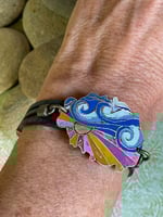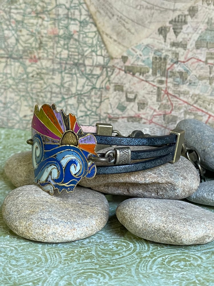 Etched in design. A 32 step process. Hand drawn, etched in an acid bath. Cleaned. Scrubbed. Sanded. Many layers of paint. Sealed 3 x’s. Holes punched. Then attached with metal components and leathers.