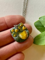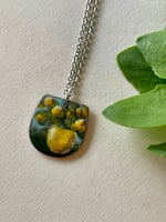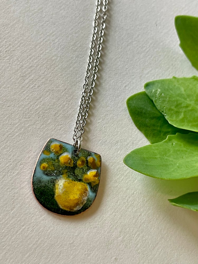 Counter enamel (backside) is a deep navy blue. Front is a small yellow flower pot with hand painted liquid enamels.