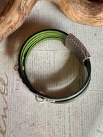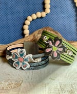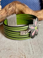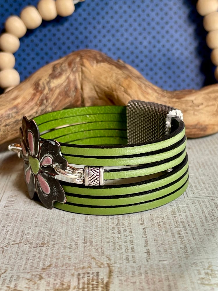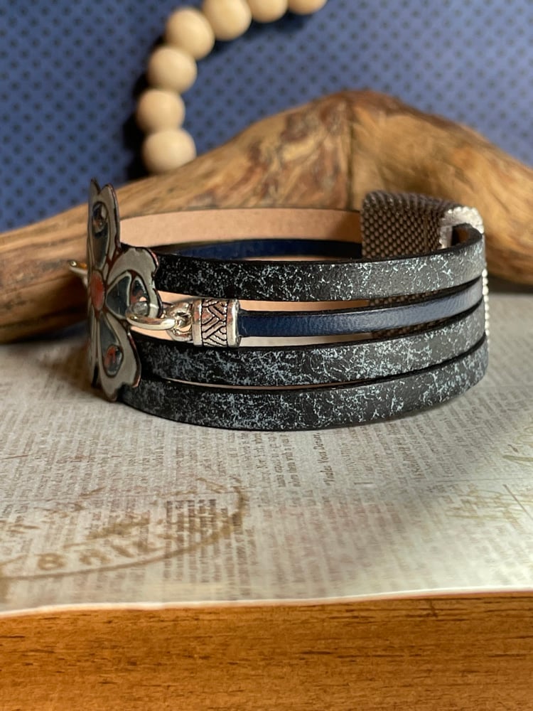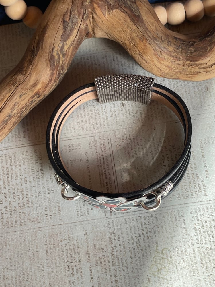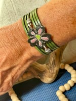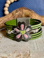 Copper flower base shape. Counter (backside) enamel of dark blue. Liquid enamel of white then painted to dry. Then sgraffito design ito flower pattern. Torch fired. Then colored liquid enamel painted again and again, cleaning lines. Torch firing. Clean edges. Using silver tone finding and end caps with a magnetic clasp closure to finish off a most elegant piece.