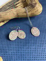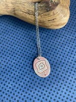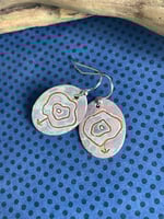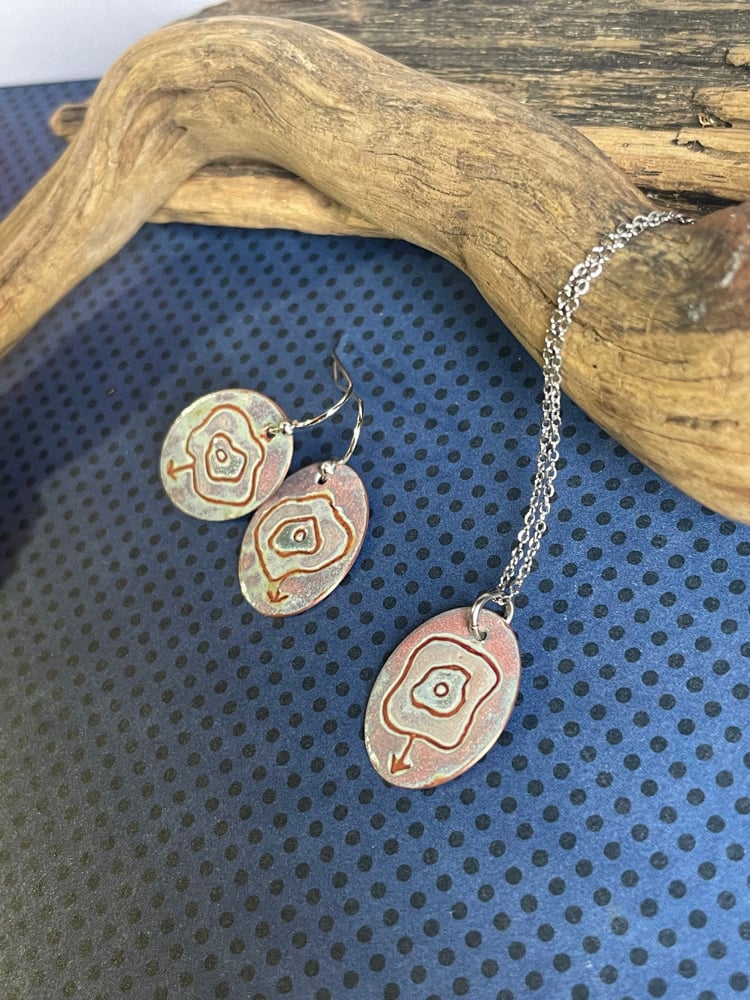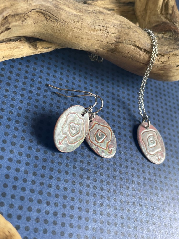 Then front painted with white enamel. Dried. Then sgraffito design, torch fired. Then painted colors with wet enamel. Let dry. Clean design, then torch fired again. Sanded edges.