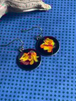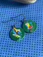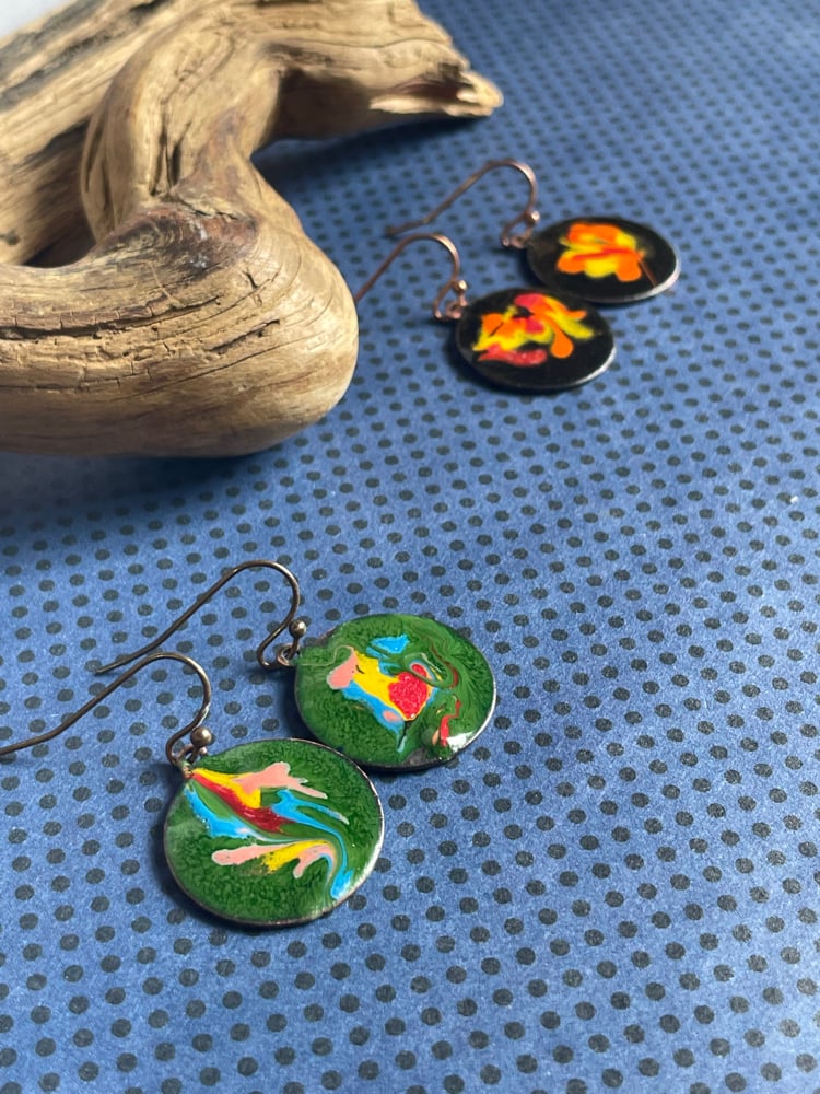Enameling a base color (counter enamel / backside) then with a wet enamel, painting top with colors. Torch fired, while hot and melted, using tool to ‘scroll’ the hot glass in to swirls