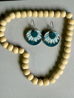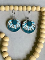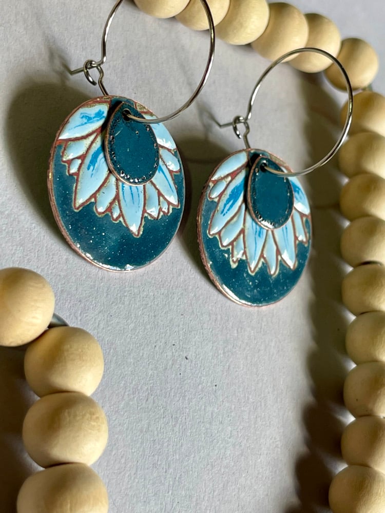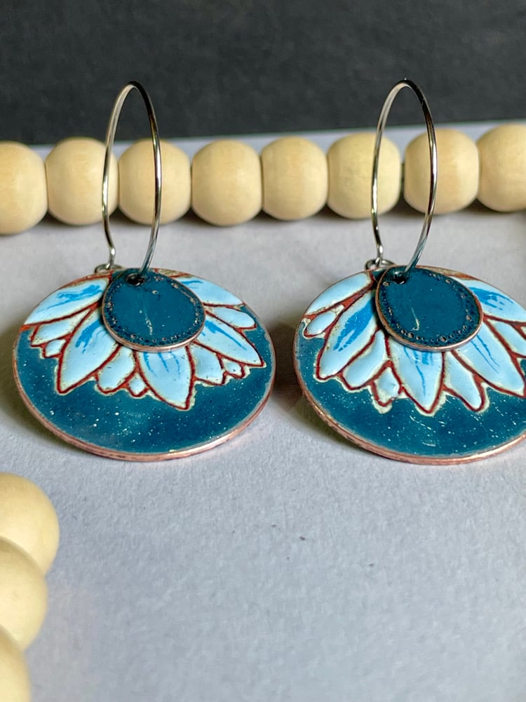 Then front painted with white enamel. Dried. Then sgraffito design, torch fired. Then painted colors with wet enamel. Let dry. Clean design, then torch fired again. Sanded edges.