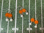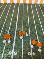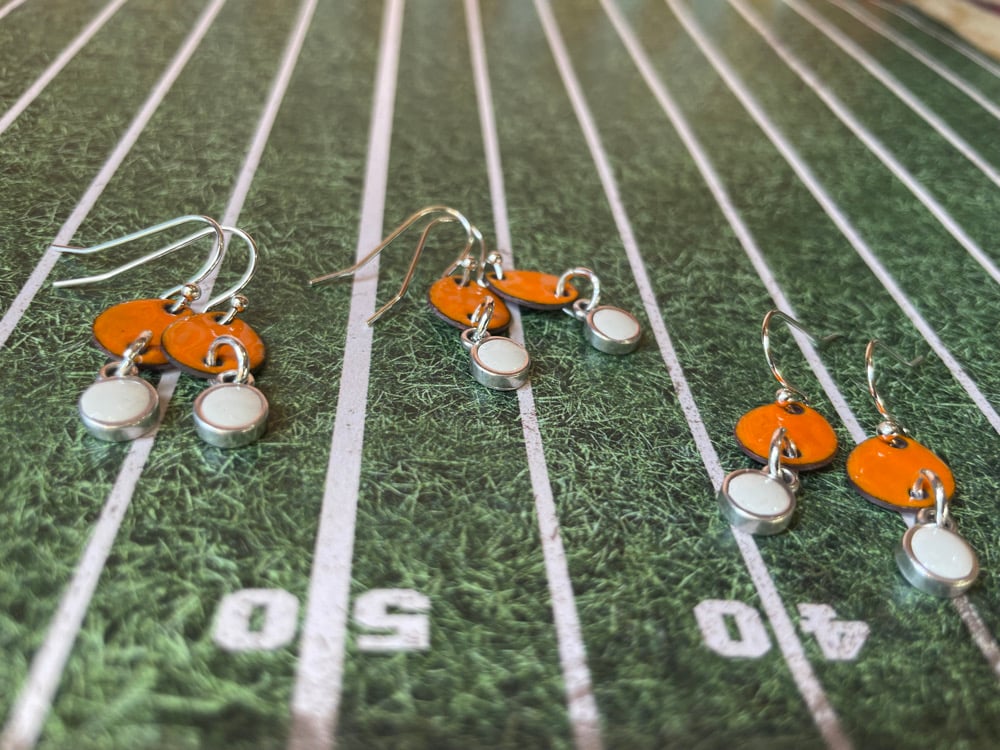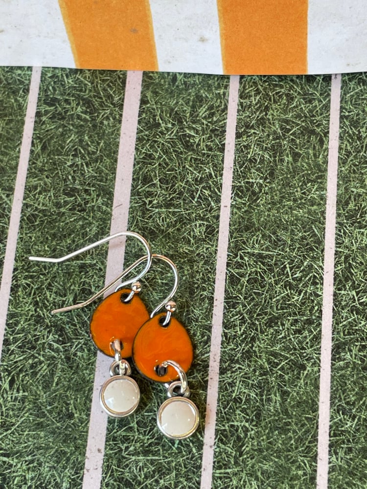 Enameled orange tear drop with Vol orange attached with an epoxy white circle dangle.