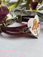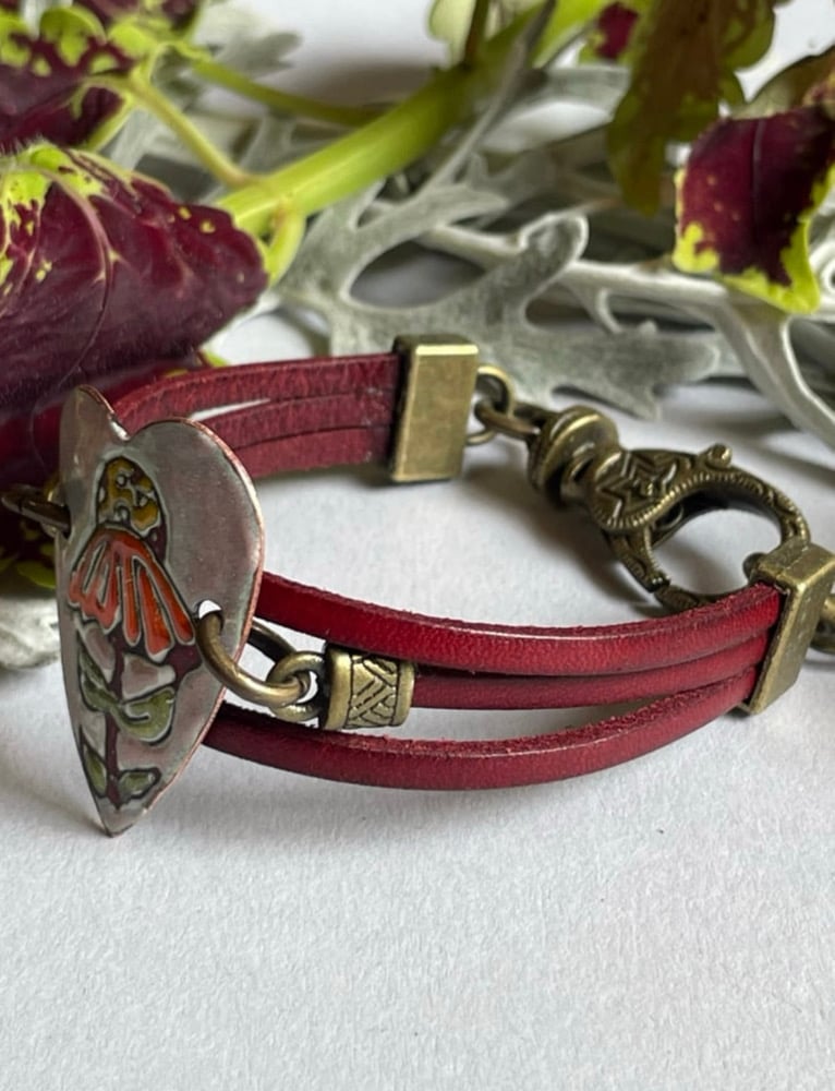 Then front painted with white enamel. Dried. Then sgraffito design, torch fired. Then painted colors with wet enamel. Let dry. Clean design, then torch fired again. Sanded edges.