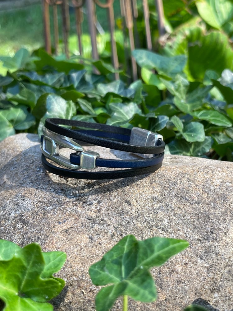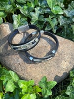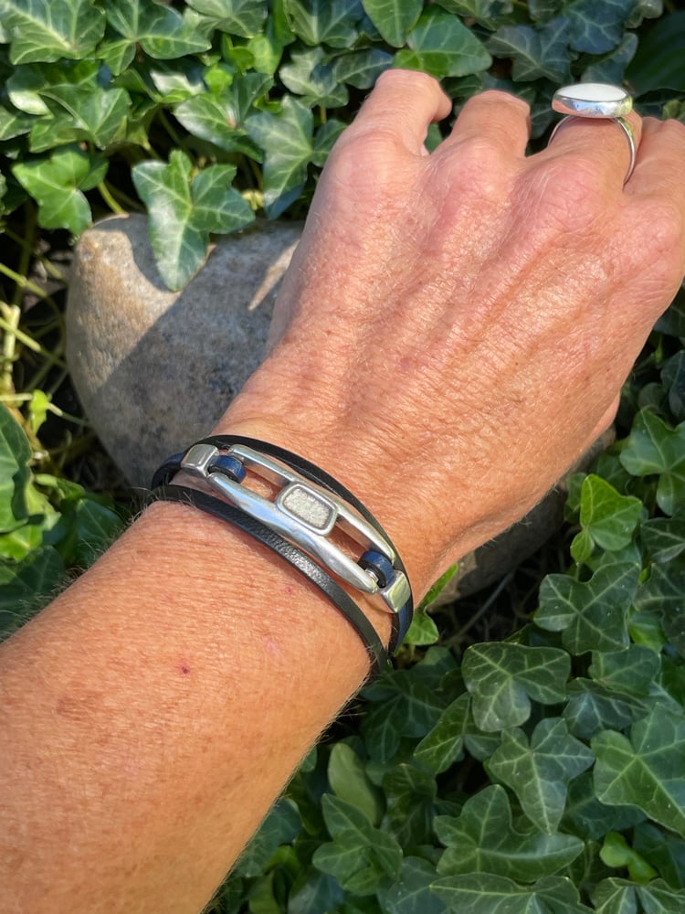 Large obscure focal piece held with loop ends. 3mm double black leather.