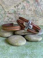 2- Large cross focal piece with 2 stitched saddle brown leathers.