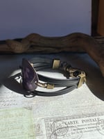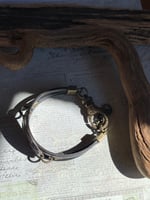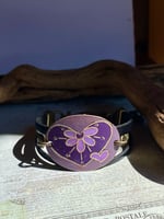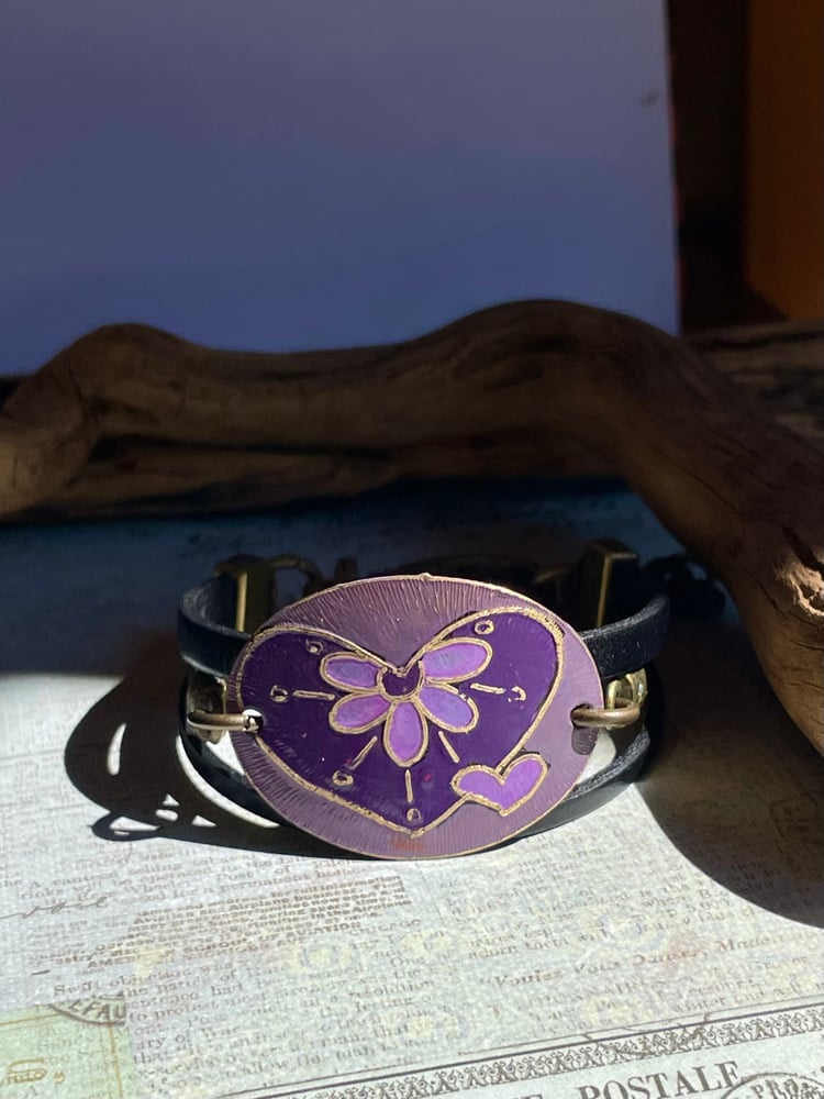 Etched in design. A 32 step process. Hand drawn, etched in an acid bath. Cleaned. Scrubbed. Sanded. Many layers of paint. Sealed 3 x’s. Holes punched. Then attached with metal components and leathers.