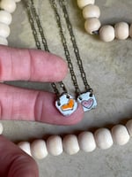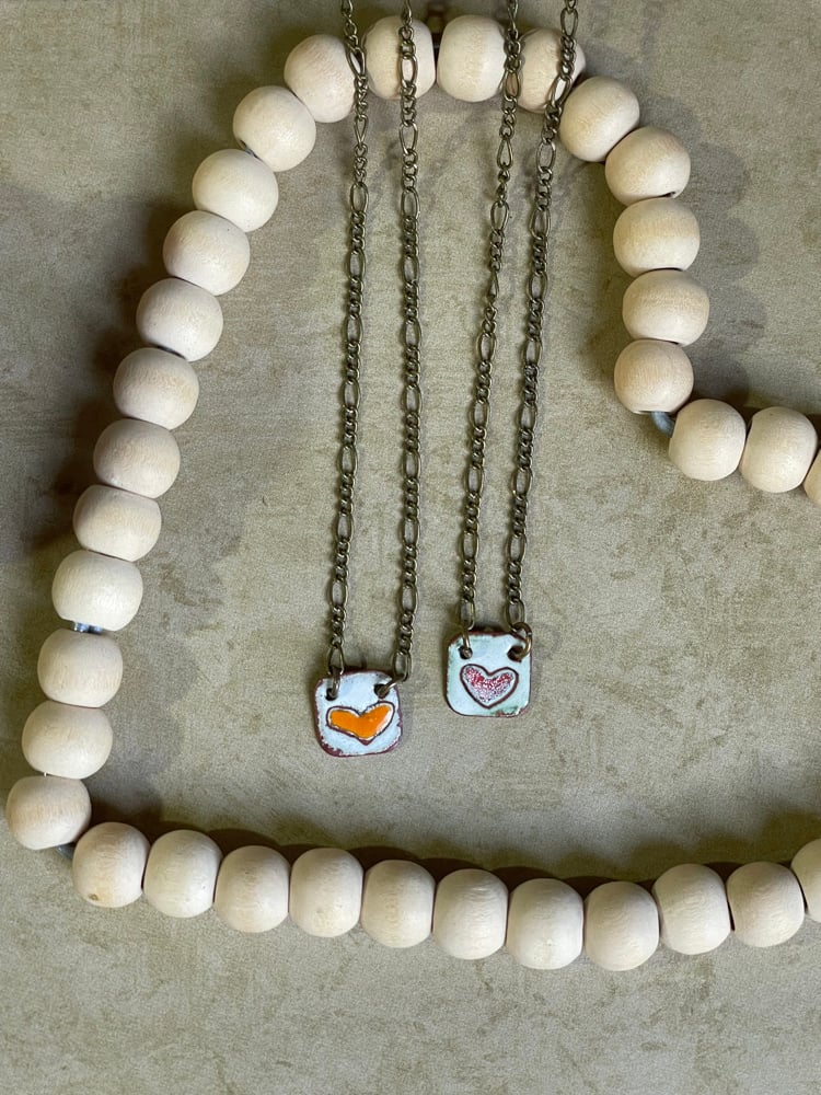 Painted wet enamel to copper. Dried. Drawn / Sgraffito- Torch fired. Painted color of heart. Dried. Torch fired again. Sanded.