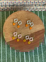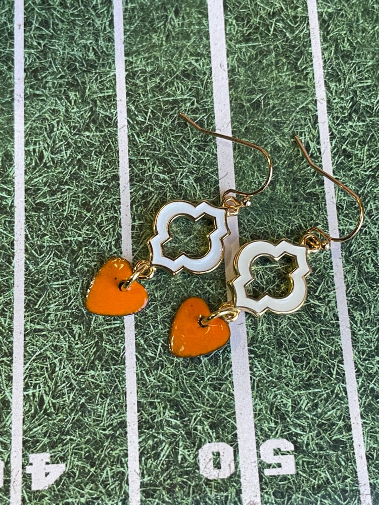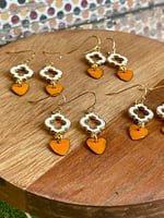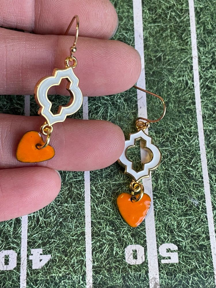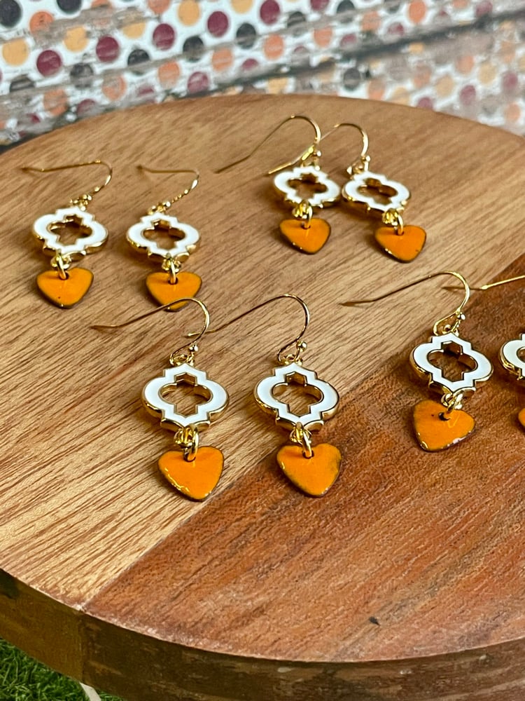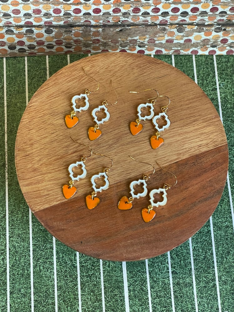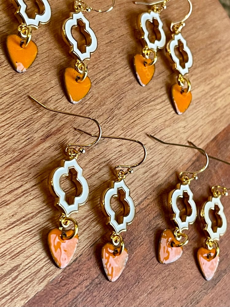 Moroccan inspired shape of epoxy white to gold with VOL orange enameled hearts.